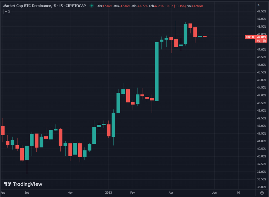 É possível analisar a dominação do BITCOIN sobre as demais moedas digitais, da mesma forma que estamos vendo uma migração de recursos das moedas mais voláteis para o ouro. Além da migração dos ativos digitais de volta para o BITCOIN, mostrando assim o aumento das reservas que o mercado de criptomoedas está vivendo.