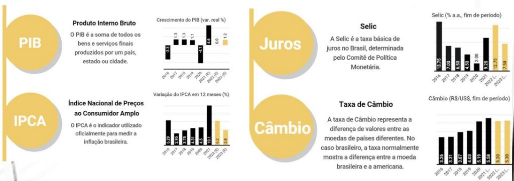Primeiro, é importante trazer uma breve compilado do ano, já que estamos falando de projeções, em 2022 nós vimos: Economia global se afunilando e o Brasil sendo visto como possível válvula de escape, conflito entre Rússia e Ucrânia, fazendo a diferença no preços de muitos produtos de consumo brasileiro, China e Estados Unidos que, apesar de uma leve recuperação no ultimo trimestre do ano, ainda possuem altas taxas de desemprego, inflação e taxa de juros. Selic no Brasil com altas consideráveis a cada reunião do Comitê de Politica Monetária, tornando a renda fixa cada vez mais atrativa.
